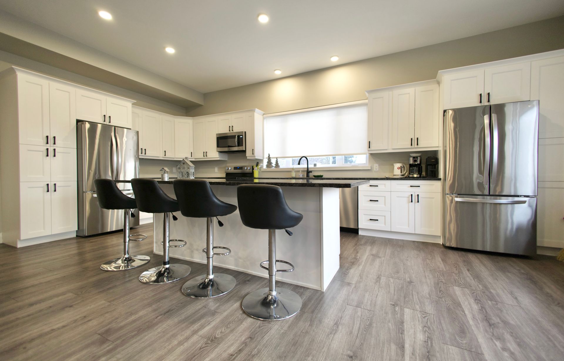 The fully equipped kitchen features a four-seat island, and the indoor dining room comfortably seats 24.